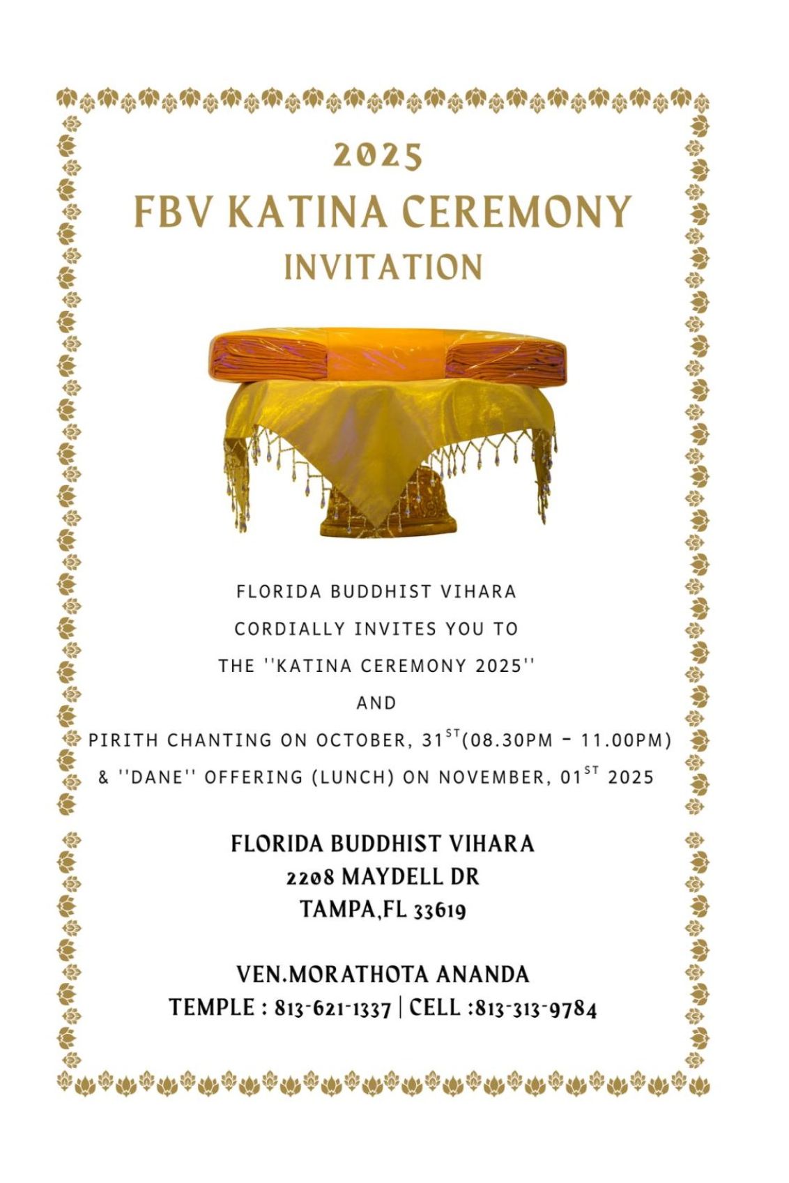 Florida Buddhist Vihara cordially invites you to the ”Katina Ceremony 2025” and Pirith chanting on Friday, October 31 and ”Dane ” offering (Lunch) on Saturday, November 01 at the Florida Buddhist Vihara premises.